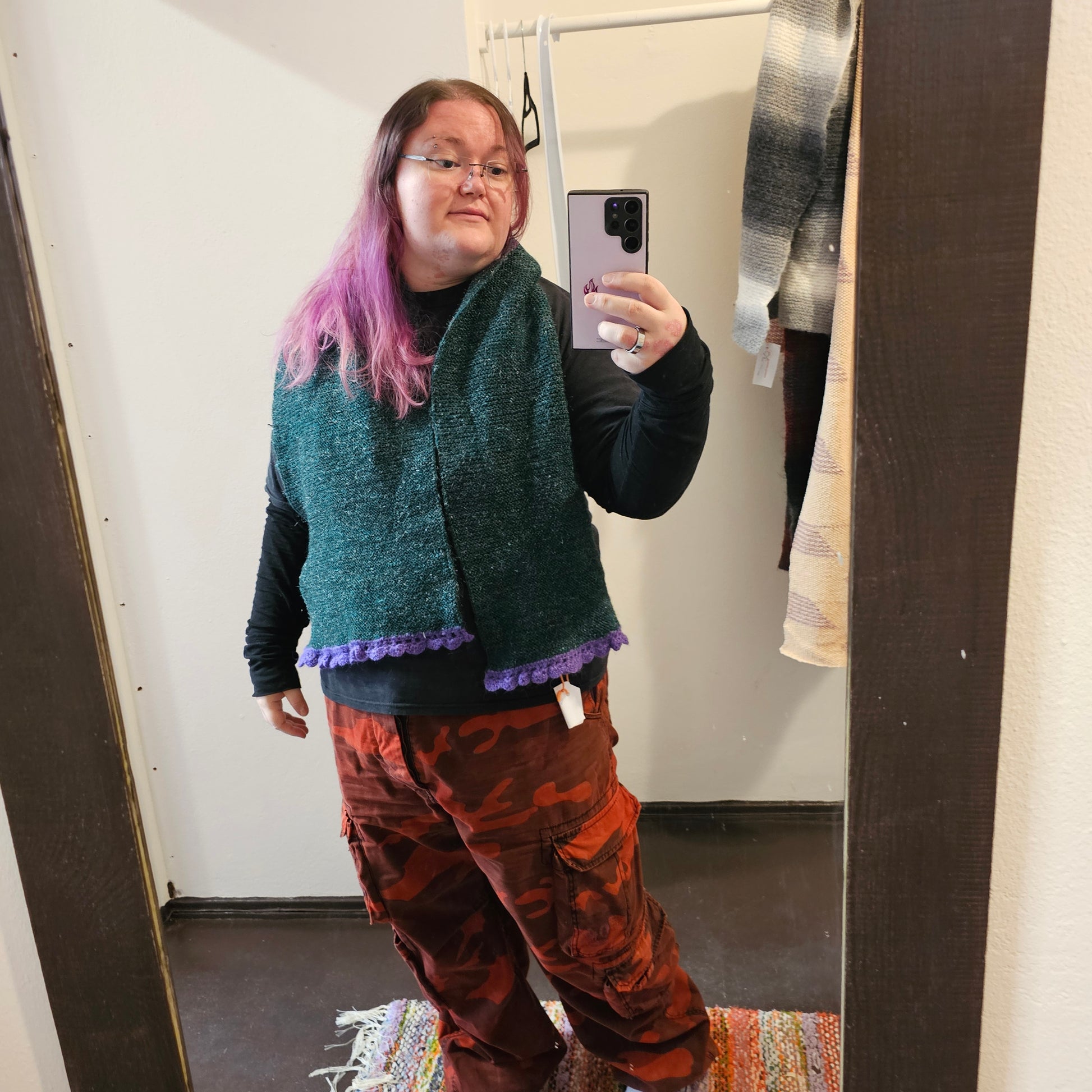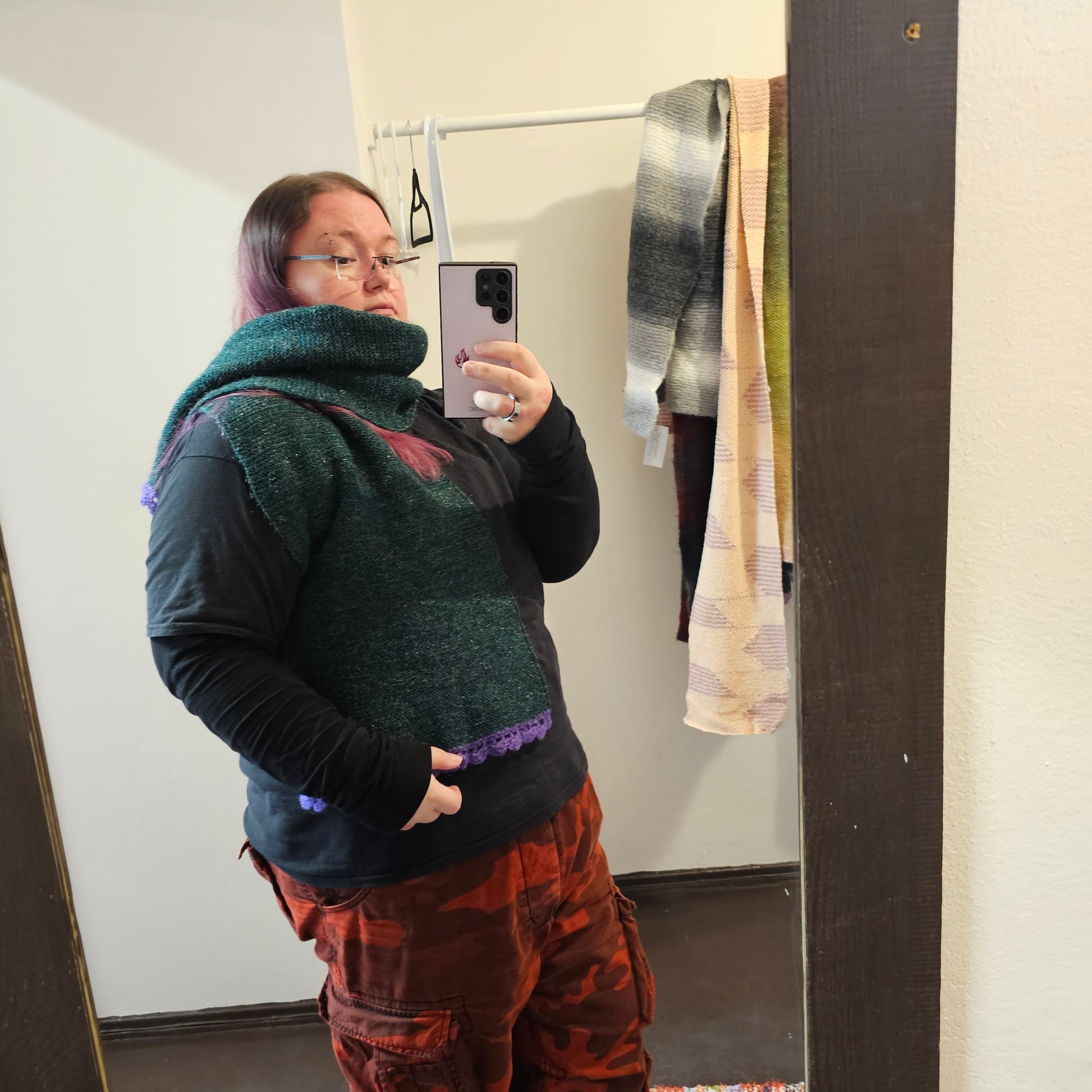 Vihreä kimaltava kaulaliina tummepi lila pitsi